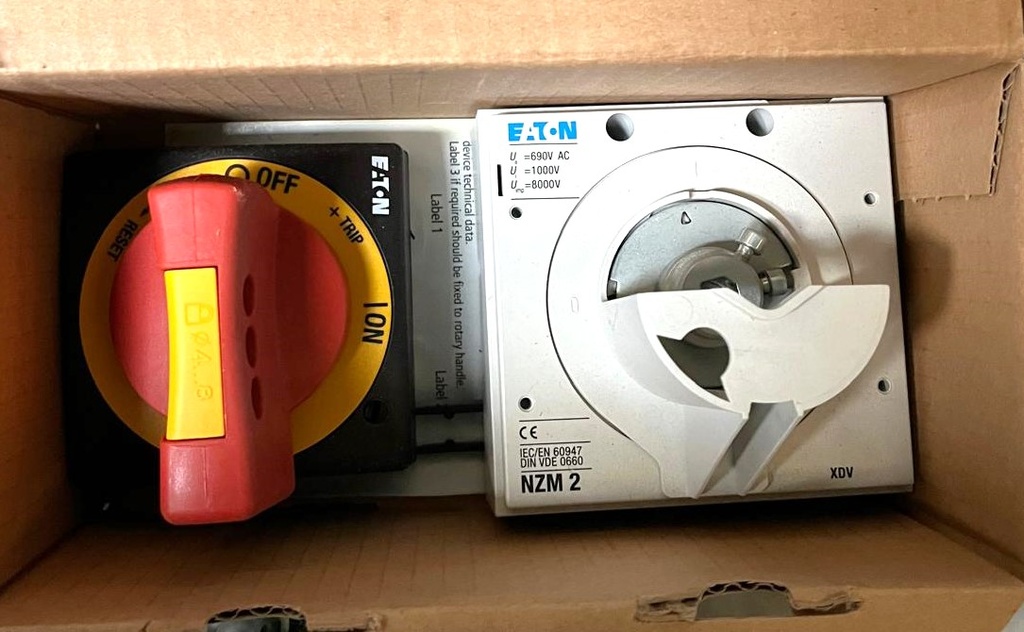 Eaton Moeller serie NZM - Interruptor automático de caja moldeada. Maneta giratoria de acoplamiento de puerta, rojo-amarillo para desconexión de emergencia, tamaño 2